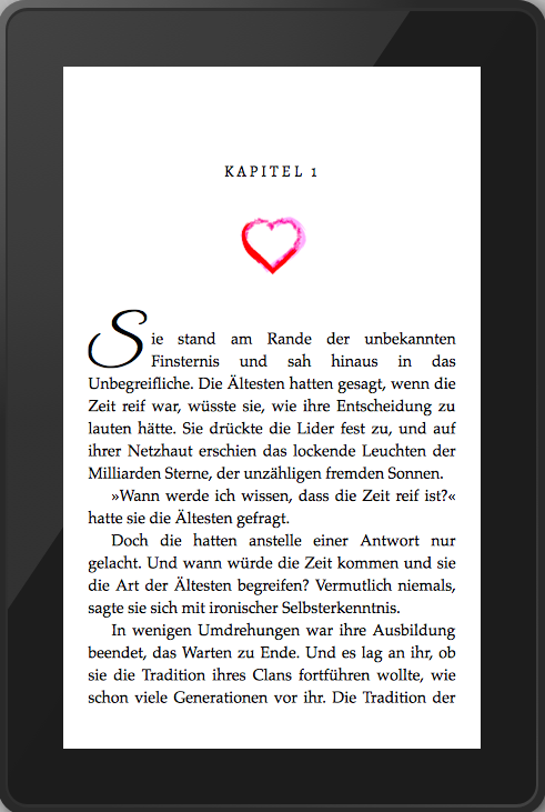 - Ihr könnt zwischen mehreren Designs wählen und habt sogar die Möglichkeit, eine Grafik an den Kapitelanfang zu setzen (die Vorlage solltet ihr mir am Besten als PNG-Datei liefern). Bitte bedenkt, dass jede Grafik das eBook "dicker" macht und Amazon dafür höhere Lieferkosten abziehen wird.
